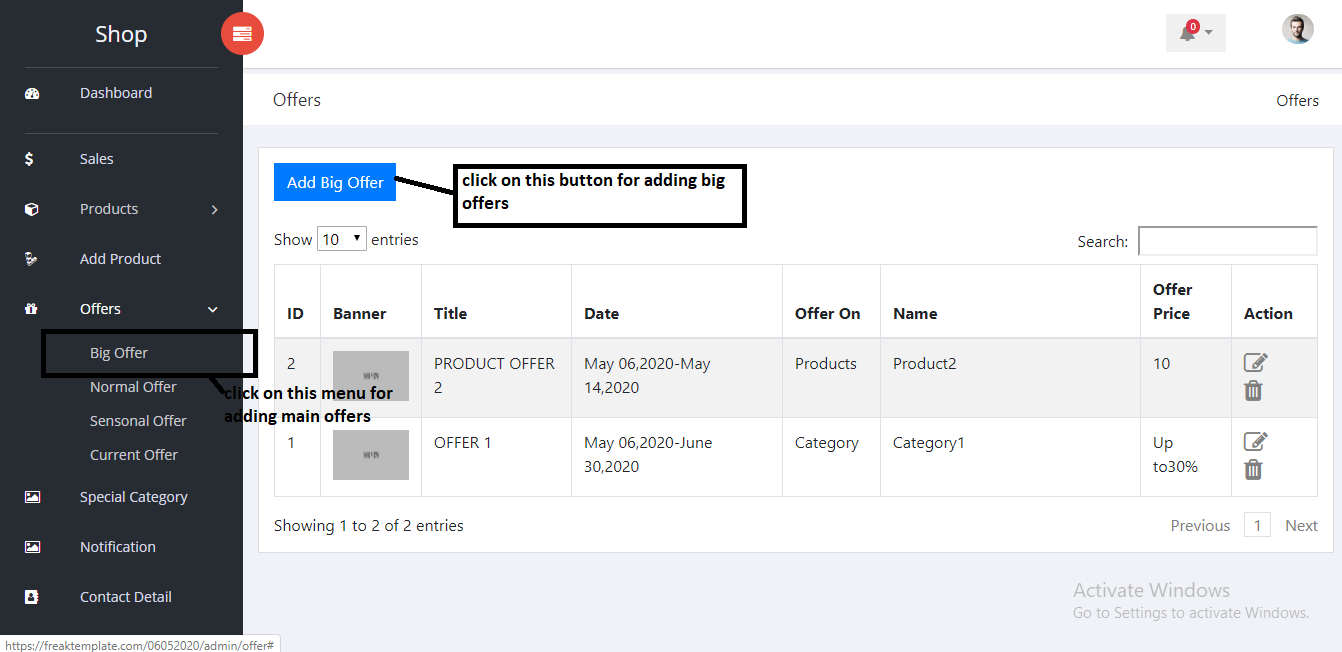 Main offers are two types Category and Product